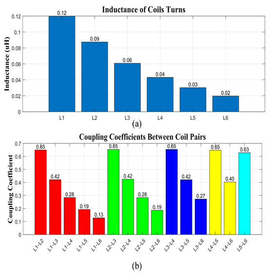 The inductance of the coil (L) is calculated using Equation (2), where is the permeability of free space (4π × 10−7 H/m), N is the number of turns, A is the cross-sectional area of the coil , and is the length of the coil [39]. The mutual inductance between adjacent turns (M) is given by Equation (3):