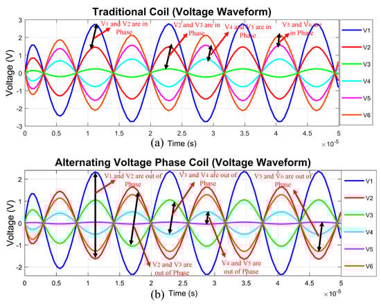 The 180 degree phase shift is achieved through the specific arrangement and sequencing of the turns in the AVPC design, where the strategic placement of turns with respect to each other promotes the desired phase opposition. The formula used in the SPICE simulation is shown in Equation (12) and demonstrates how the voltages at different nodes are averaged, leading to an effective phase shift. This analysis reveals the phase difference in the voltage in the AVPC compared to the traditional coil, as shown in Figure 5a,b.