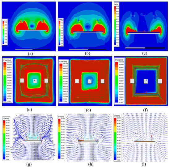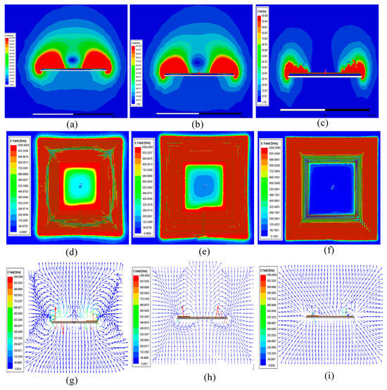 Comparison E-field distribution with a conductive aluminum plate at 100 mm distance. (a) Traditional coil side view. (b) AVPC 1 side view. (c) AVPC 2 side view. (d) Traditional coil top view. (e) AVPC 1 top view. (f) AVPC 2 top view. (g) Traditional coil side view vector distribution. (h) AVPC 1 side view vector distribution. (i) AVPC 2 side view vector distribution.