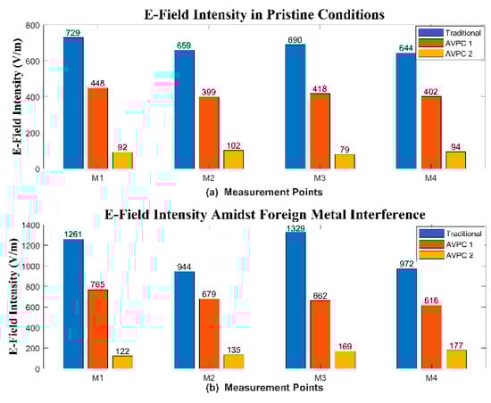 Figure 7 presents a detailed comparison of electric field (E-field) intensities measured at specific points, illustrating the effectiveness of the AVPC designs in managing electromagnetic fields under various conditions. The measurement points M1 (X = 0, Y = 120, Z = 100 mm), M2 (X = 0, Y = 160, Z = 100 mm), M3 (X = 0, Y = −120, Z = 100 mm), and M4 (X = 0, Y = −160, Z = 100 mm) are strategically located at different coordinates. Figure 7a provides baseline E-field measurements at a 100 mm distance along the Z-axis in an environment free from external influences, while Figure 7b reveals the E-field intensities in the presence of foreign metal objects, demonstrating the robust capability of the AVPC designs to mitigate E-field disturbances.