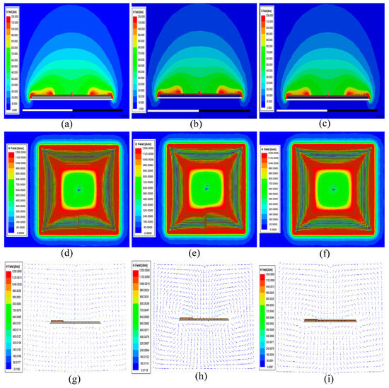 Comparison of the H-Field in the design coil paid. (a) Traditional coil side view. (b) AVPC 1 side view. (c) AVPC 2 side view. (d) Traditional coil top view. (e) AVPC 1 top view. (f) AVPC 2 top view. (g) Traditional coil side view vector distribution. (h) AVPC 1 side view vector distribution. (i) AVPC 2 side view vector distribution.