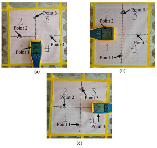 Figure 12 illustrates the specific measurement points on each coil design, providing a visual representation of the locations where E-field data were collected. The arrows in Figure 12a–c indicates the four strategic points around the traditional coil, AVPC 1, and AVPC 2, respectively, where the E-field measurements were recorded.