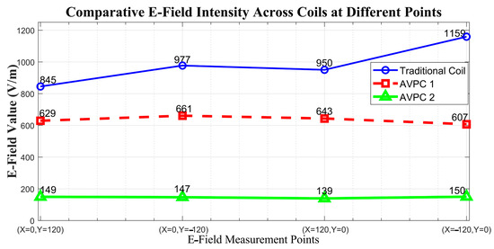 A comparative analysis of electromagnetic field distributions, focusing on electric field (E-field) emissions for both traditional and AVPC designs, demonstrates the AVPC’s enhanced effectiveness in E-field mitigation. As demonstrated in Figure 6, the E-field intensity around the traditional coil is noticeably higher compared to the AVPC models, which exhibit a significant reduction in E-field intensity. This reduction is quantitatively supported by the data presented in Figure 7, where the AVPC designs consistently show lower E-field intensities at various measurement points.