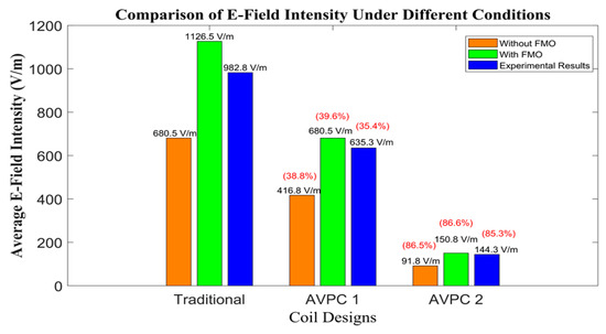 To provide a comprehensive view, Figure 14 presents the average E-field intensities under different conditions for each coil configuration. The conditions evaluated include scenarios without an environmental effect (Without FMO), as well as those with an environmental effect introduced by the presence of foreign metal objects (With FMO). Practical experimental results were also considered, providing a triangulated approach to understanding E-field behavior in varying environmental contexts, including the presence of conductive materials like vehicle bodies. This understanding essential for the widespread adoption and public acceptance of wireless charging technology, particularly in the automotive industry.