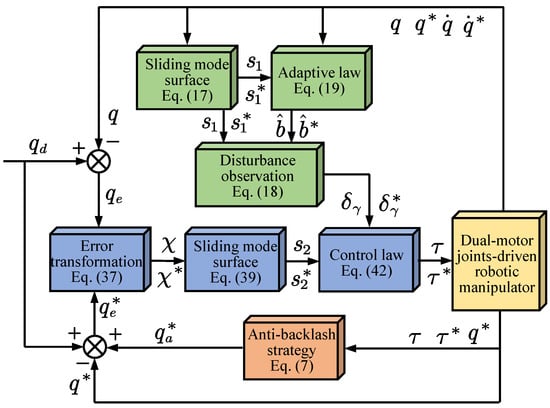 Schematic representation of the proposed control strategy consisting of three parts: APDMAB (orange block), ASMDO (green block), and PPC-based NFTSMC (blue block), where the superscript {•}* is defined as the variables related to the auxiliary motor of each dual-motor joint and the remaining variables come from the primary motor.