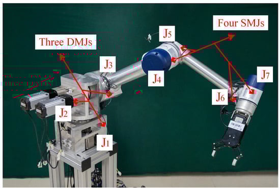 The 7-DoF serial-type robot (named D-Arm) is depicted in Figure 2. This manipulator is composed of three dual-motor joints (DMJs, labeled as to ) and four single-motor joints (SMJs, labeled as to ). The DMJs, positioned near the base, are instrumental in enhancing the accuracy, payload capacity, and reliability of the robotic system. Conversely, the SMJs, characterized by a high torque-to-weight ratio, are strategically employed to address the challenges posed by gravitational and inertial forces near the end-effector. Further insights into the design and capabilities of this robotic system are elaborated in [].