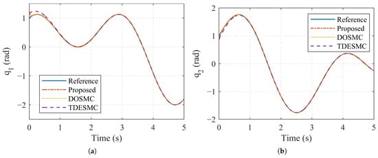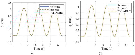 Trajectory tracking profiles of each joint. (a) Trajectory tracking profiles of joint 1. (b) Trajectory tracking profiles of joint 2.