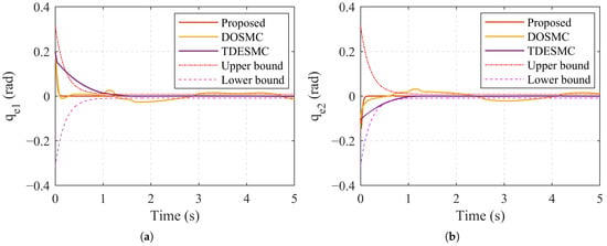 Trajectory tracking errors of each joint. (a) Trajectory tracking errors of joint 1. (b) Trajectory tracking errors of joint 2.