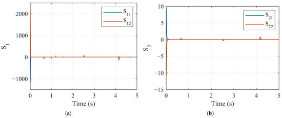 As depicted in Figure 5, the initial response of the TDESMC algorithm is relatively slow, and the tracking error occasionally surpasses the predefined performance bounds. Furthermore, the DOSMC algorithm struggles to ensure the prescribed tracking performance metrics when subjected to disturbances, despite exhibiting a satisfactory transient-state response. In contrast, the proposed method consistently meets the prescribed performance criteria, even in the presence of uncertainties and disturbances. The sliding variables of two joints for the proposed method are shown in Figure 6. It is observable that the sliding mode surface variables fluctuate when the joint rotation direction changes (in the presence of nonlinear friction), whereas the stability of the system is still maintained. We can state that the proposed method has strong robustness.