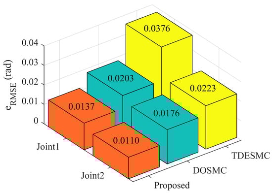 The comparative results, as depicted in Figure 7, demonstrate that our proposed control strategy yields RMSE values of 0.0137 for joint 1 and 0.0110 for joint 2. The proposed control scheme delivers superior tracking precision in comparison to the other two benchmark control methods.