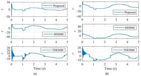 The control torque responses of three control methods are shown in Figure 8. The control torque of TDESMC has large oscillation in the initial processing and the control torque of other two methods are relatively smooth in the control processing.