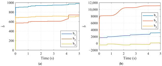 Adaptive parameter response of the observer of each joint. (a) Adaptive parameter response of the observer of joint 1. (b) Adaptive parameter response of the observer of joint 2.