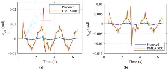 Trajectory tracking errors of each dual-motor joint. (a) Trajectory tracking errors of joint 1. (b) Trajectory tracking errors of joint 2.