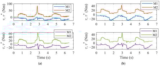 Output torque of each joint. (a) Output torque of joint 1. (b) Output torque of joint 2.