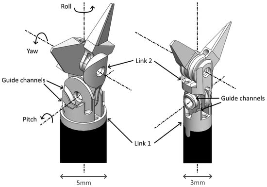 Cleft palate surgical tool pulleyless wrist designs: 5 mm (left) and 3 mm (right). Pitch, yaw, and roll axes are shown. Guide channels (highlighted) on link 1 reduce the length of the link, allowing for more compact articulation.