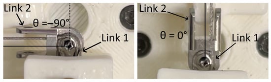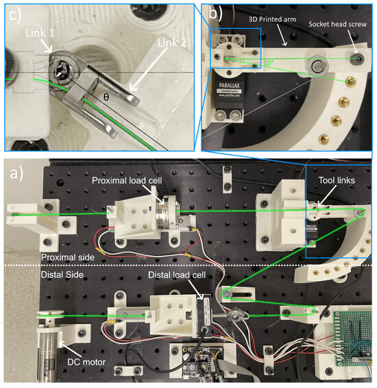 The distal load cell (SML low-height load cell, Interface Force Measurement Solutions, Scottsdale, AZ, USA) is rigidly attached to the proximal end of the distal carriage. On the proximal side of the links, a 150-gram payload pulls the proximal carriage on a linear rail. The proximal load cell (ATI mini40, ATI Industrial Automation, Apex, NC, USA) is attached to the distal end of the carriage. Through a series of pulleys, a stainless steel cable is connected to the two load cells. This cable runs along the guide channels of link 1 and link 2 (Figure 2), representing the actuation cable of the instrument. The cable used is a 0.2286 mm () 7 × 7 core stranded stainless steel cable (Carl Stahl Sava Industries, Inc., Riverdale, NJ, USA).