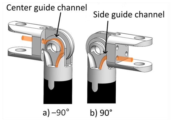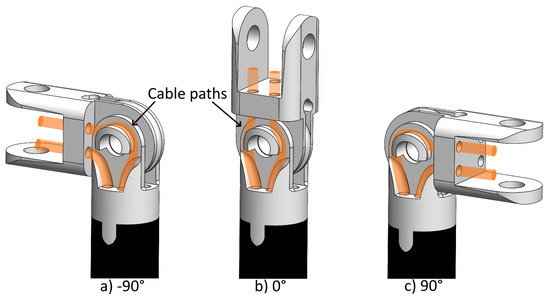 Link 1 and link 2 of 3 mm wrist at various pitches with cable paths highlighted in orange. (a) −90°, (b) 0°, (c) 90°.