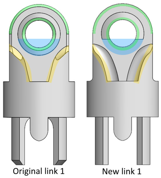 Design changes to original link 1 of 3 mm wrist. Changes include removing thin edges (yellow), fillets (green), and the bottom of the center guide channel (blue). Through-holes of the original link 1 were also straightened (not shown).