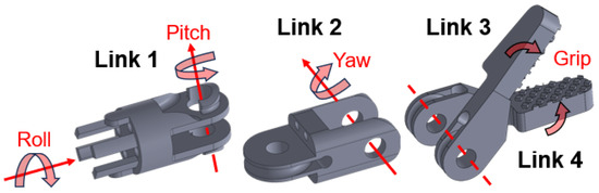 The motor turns at a constant angular velocity through open-loop angular speed control using an off-the-shelf motor controller and the motor’s built-in encoder. An angular speed set-point of 60 rpm was used, resulting in a steady-state cable speed of 4.2 mm/s, which conveniently allowed for 60-second-long trials during experimentation. The load cells measured the cable’s tensions at the distal and proximal sides of the tool links. Link 1 was fixed while link 2 was pitched relative to link 1. The links used in this experiment underwent minor design changes to the mechanism described by Wu et al. [6]. This allowed for fabrication using computer numerical control (CNC) techniques as opposed to direct metal laser sintering (DMLS). These design changes include removing thin edges and unnecessary fillets, straightening through-holes to avoid bent channels, and removing part of the center groove (Figure 4). The links were machined from 316 stainless steel with a deburred finish, resulting in smoother parts. Figure 5 shows an exploded view of the 4 links that make up the wrist mechanism (with a needle-driver tip), with annotations indicating the 4 DOFs.