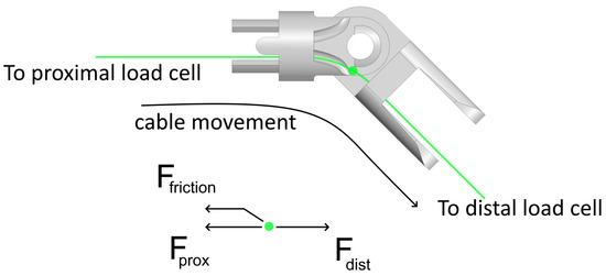 The distal and proximal load cells measured the cable tension before and after the links. Data from the proximal load cell (ATI Mini40) were acquired via a National Instruments DAQ and PCI processing board, while the data from the distal load cell (SML-110N) were passed into a Futek (FUTEK Advanced Sensor Technology, Inc., Irvine, CA, USA) DAQ. The raw data from both DAQs were then fed to the main controller PC, which filtered the data in software through a Matlab low-pass filtering script. The data collected during cable acceleration were identified visually from plots of the raw data and removed manually from the data set during post-processing. Friction was determined by subtracting the proximal from the distal cable tension, as per Figure 6 and Equation (1). The average friction for each pitch angle was then calculated: