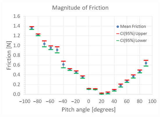 The average magnitude of friction as a function of pitch follows an asymmetric parabolic shape (Figure 7) with a minimum of 0.02 N at a pitch angle of 20°. The maximum friction occurred at −90° with a magnitude of 1.4 N. This peak friction was approximately 93% of the applied load.