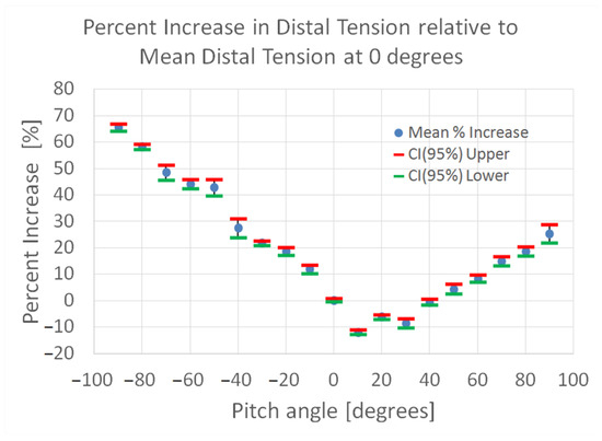 Figure 8 shows the percentage change in friction at different pitch angles relative to the friction at the neutral position (i.e., pitch = 0°). A similar parabolic trend can be observed in this plot as well. The maximum percent increase (67.3%) in cable tension also occurred at −90°. It should be noted that the cable tension for pitch angles between 0° and 40° is lower than that at neutral since the cable lifts off the central guide channel within this pitch range, resulting in a lower surface area of the contact between the cable and the links. As such, the percentage increase in cable tension is negative in this range.