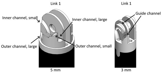 Link 1 of the 5 mm tool’s four unique guide channels (left). Link 1 of the 3 mm tool’s guide channels (right).