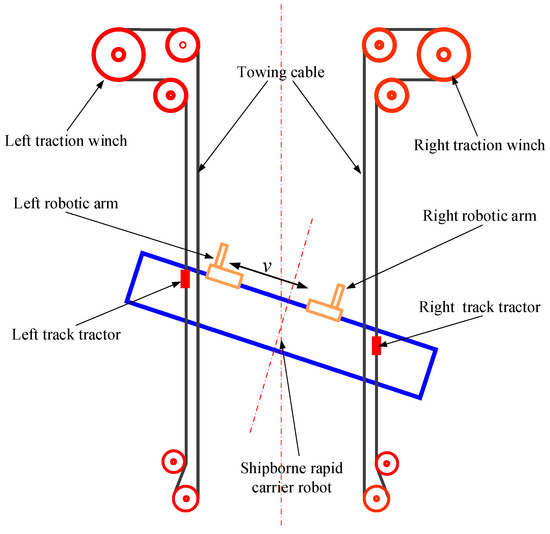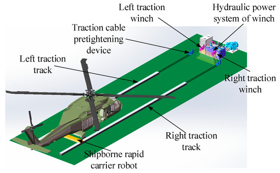 The research object in this paper is the SRCR, focusing on the helicopter deck towing operation. The simplified system principle is shown in Figure 1 and Figure 2. Figure 1 is a schematic of the three-dimensional layout of the traction system. Figure 2 shows the schematic diagram of the towing system principle, and Figure 3 shows the three-dimensional structure of the SRCR.