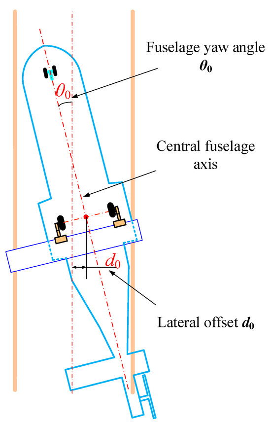 To quantitatively evaluate the deviation between the actual and ideal landing positions, this paper decomposes the offset of the actual landing position relative to the ideal landing position. The offset can be categorized into two types: lateral position offset and fuselage direction angle offset. These are referred to as lateral offset d0 and fuselage yaw angle θ0, as shown in Figure 5. Therefore, the objective of the helicopter deck position is to eliminate the lateral offset and the fuselage yaw angle. The SRCR is equipped with angle sensors and displacement sensors, allowing for real-time monitoring of the helicopter’s fuselage yaw angle θ and lateral offset d.