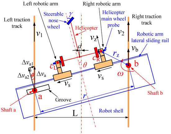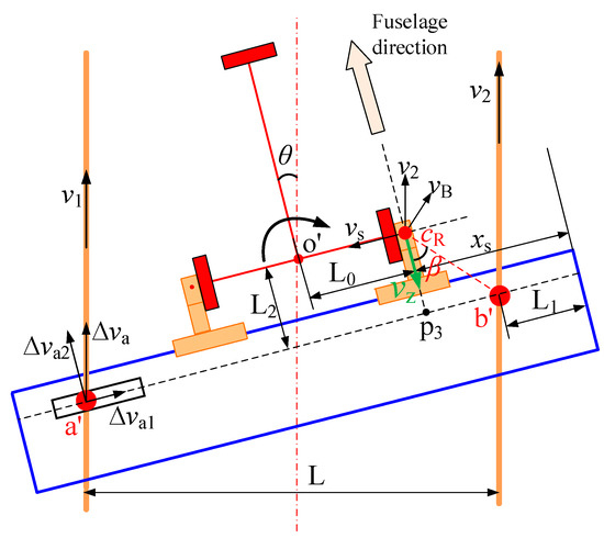 Next, the rotating motion of the helicopter is shown in Figure 7b. After adjusting the angle of the steerable nose wheel γ to 90°, the left and right winch traction speeds and the correction speed of the robotic arm are cooperatively controlled to rotate the helicopter around the center point O′ of the main wheel shaft. When the direction of the helicopter fuselage is parallel to the tracks’ centerline, the fuselage yaw angle is reduced to zero, indicating the completion of the stepwise rotational correction.