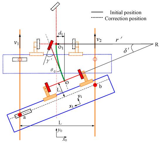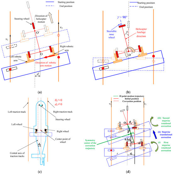 Firstly, the translation motion of the helicopter is shown in Figure 7a. The angle of the steerable nose wheel is adjusted to 0°. Then, the left and right winch traction speeds and the correction speeds of the robotic arm are cooperatively controlled to move the helicopter along the direction of the steerable nose wheel. When the helicopter’s lateral offset d becomes 0, it marks the completion of the stepwise translation correction. This means that the center point O of the helicopter’s main axle has reached the centerline of the left and right traction tracks, indicated as point O′ in Figure 7a.