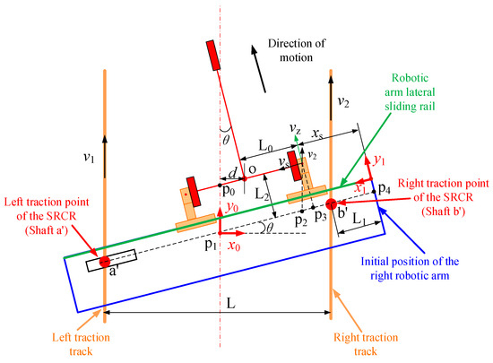 The initial positions of the left and right robotic arms are at the left and right ends of the robotic arm’s lateral sliding rail, respectively. The physical meanings of the marked parameters in Figure 8 are as follows. xs represents the distance between the current position and the initial position of the right robotic arm (the sliding displacement of right robotic arm); L0 represents the distance from the initial position of the right robotic arm (i.e., axis y1) to the center point O of the helicopter’s main wheel; L1 represents the distance between the right traction point of the SRCR (i.e., shaft b′) and the initial position of the right robotic arm; L2 is the distance between the main wheel shaft and the line connecting the left and right traction points (i.e., a′–b′); points p0~p4 are auxiliary points, and the dotted line is the auxiliary line. It is assumed that θ counterclockwise is positive and clockwise is negative.
