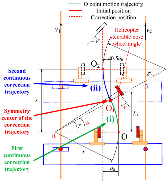 The operation process of continuous correction method under parallel landing position is as follows. Firstly, based on the transverse offset d0 and Formula (24), the pilot sets the helicopter’s steerable nose wheel angle γ. Then, the helicopter moves along the first arc in Figure 10 under the traction of SRCR. When the current lateral offset d is reduced to half of the initial lateral offset d0, it indicates that the center point O of the helicopter’s main wheel shaft has reached the symmetry center point O1 of the two correction trajectories. At this time, the pilot changes the steerable nose wheel angle to the same magnitude in the opposite direction, and the helicopter moves along the second arc . Finally, when current lateral offset d returns to 0, the center point O of the helicopter reaches O2, completing the correction operation.