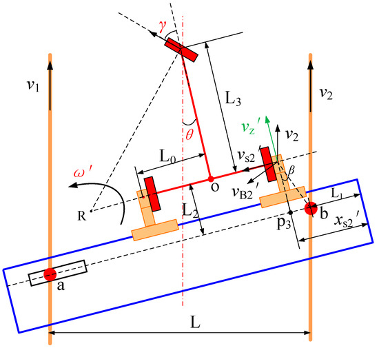 Through the kinematic analysis of the SRCR, the schematic is shown in Figure 6. The motion trajectory of the SRCR is determined by the traction velocities of the left and right winches, denoted as v1 and v2, respectively. The traction speeds are assumed to be positive in the direction shown in Figure 6. The left and right winches transmit power through shafts a and b on the SRCR, with the velocities of a and b denoted as va and vb, respectively. Shaft b is the base point of the SRCR’s planar motion, its velocity vb is equal to the right traction velocity v2, and va is equal to the left traction velocity v1. The relationship between the velocities va and vb can be expressed as follows: