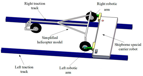 The ideal landing position of the helicopter is characterized by two key factors. The center point of the helicopter’s main axle should be located on the center line of the two traction rails, and the fuselage should be parallel to the traction rails, as shown in Figure 4. However, the actual landing position is often uncertain due to factors such as the unpredictable motion of the ship, airwake disturbances, and the pilot’s control accuracy.