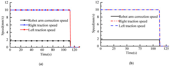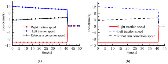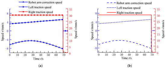 The relationship between the left and right traction velocities v1 and v2 and the relationship between the right robotic arm correction velocity vs and traction velocity v2 are shown in Equations (22) and (23), respectively.