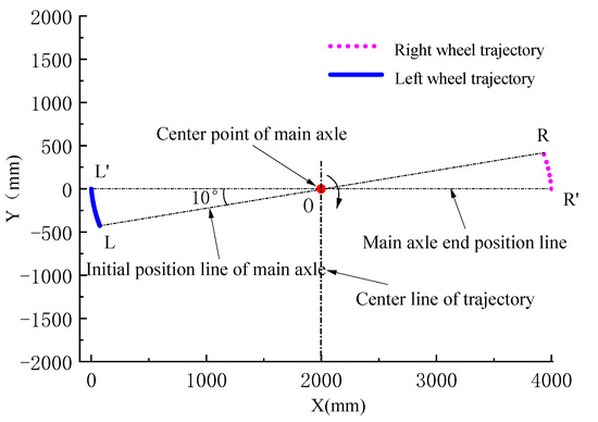 The continuous correction method for the cross landing position is similar to that for the parallel landing position, but it requires only one arc. The principle diagram is shown in Figure 11. In Figure 11, the green arc represents the motion trajectory of the center point of the main wheel shaft, γ′ is the helicopter steerable nose wheel angle, and r′ is the correction arc radius.