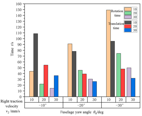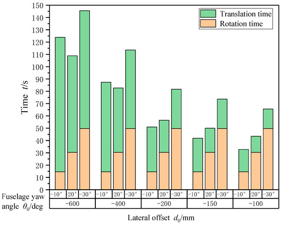 - According to Figure 22 and Table 6, in the correction process for the parallel landing position, when the lateral offset d0 is −1200 mm or −800 mm, the total correction time t is minimized when the fuselage yaw angle θ for the first stepwise rotational correction is −20°. For lateral offsets d0 of −400 mm, −300 mm, and −200 mm, the total correction time t is minimized when the fuselage yaw angle θ for the first stepwise rotational correction is −10°.