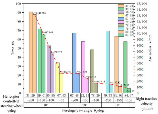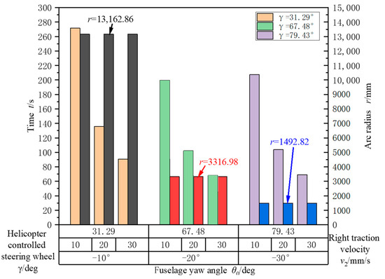 - Comparing serial numbers 1-2-3-4, 5-6-7, 8-9-10 and Figure 24, it is evident that with a fixed initial yaw angle |θ0|, a larger helicopter control wheel angle |γ| results in a smaller helicopter correction radius r and a shorter correction time t.