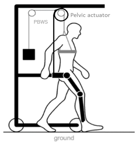 The lower-limb exoskeleton employed is the Exo-H3 (Technaid S.L., Madrid, Spain). The PBWS system and robotic mobile frame have been designed and fabricated to meet the exoskeleton’s inclusion criteria and the requirements for effective ambulatory rehabilitation. Specifically, the robotic frame accommodates pelvic movements and center-of-mass (CoM) translation in the frontal plane while ensuring proper alignment of the exoskeleton to facilitate effective weight unloading during therapy.