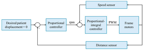 The control strategy employed by the robotic frame is velocity-based, utilizing a proportional–integral controller that outputs a pulse-width modulation (PWM) signal to the motor drivers (Figure 3). The gains are configured to ensure maximum velocity and to avoid oscillations, specifically at the point on the root locus in which the system is critically damped. The proportional gain is set to 0.8, and the system zero is 0.85. This controller adjusts the system’s output based on the error, defined as the difference between the current speed, measured by motor speed sensors, and the desired speed, which is proportional to the patient’s displacement and is measured using a distance sensor. The gain of the proportional controller is 0.929, calculated by dividing the maximum desirable speed (100 rpm) by the maximum measured distance (11.2 cm).