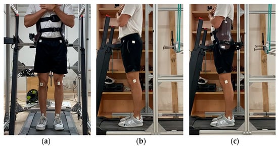 (a) Marker placement in the frontal plane. (b) Marker placement in the sagittal plane not wearing the exoskeleton corset. (c) Marker placement wearing the exoskeleton corset.