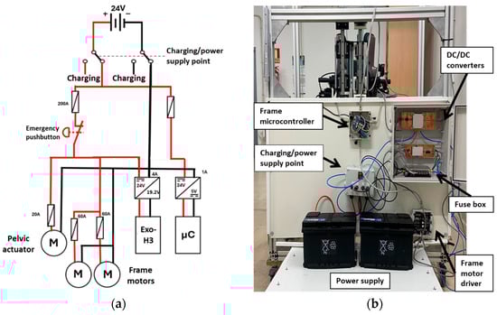 The motor power supply path includes an emergency pushbutton and connects to both the frame motors and the pelvic actuator motor directly. Moreover, it connects to the exoskeleton via a 24 V to 19.2 V converter. This design ensures that all power can be disconnected simultaneously in case of an emergency.