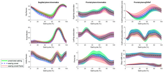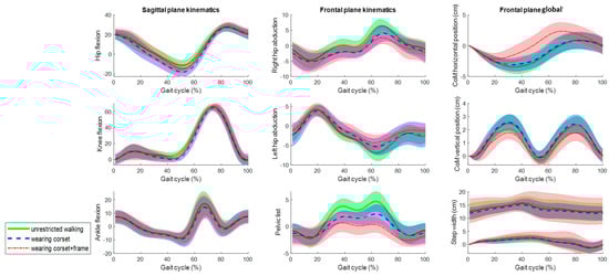 In the frontal plane, the ROM’s significant differences are shown at both speeds. However, the ROM differs up to 2 degrees comparing unrestricted walking to walking with the corset and between corset-wearing walking and while attached to the frame. Regarding the CoM displacements, although there are significant differences, the absolute differences are up to 0.6 cm. Lastly, the step width (Table 3) does not show evidence of significant differences.