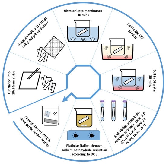 Each sample was reduced in 100 mL of NaBH4 solution at the varied settings of the DOE. A summarised methodology of IPMC sample preparation and platinisation is given in Figure 2.