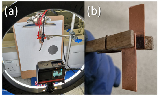 Maximum IPMC displacement was measured using a previously developed computer vision system [20]. Briefly, an Insta360 One R camera (Insta360, Shenzen, China) mounted with the 4 K wide-angle lens with F2.8 aperture was used. The narrow FOV was chosen. The resolution was set to 1080 p recording at 50 fps. A JOBY Beamo 12” ring light (JOBY, London, UK) was used as a light source at the 5600 K colour temperature mode, set to the maximum intensity level. Approximately 10 mm of the sample length was clamped to copper plates, with one side attached to the negative terminal of the power supply and the other attached to the positive terminal (as shown in Figure 5).