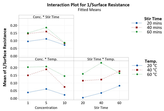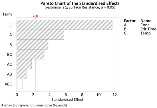 The full factorial analysis included only up to second-order terms, since incorporating third-order terms would result in a saturated model. Data transformation was carried out on the response to better fit the model. The reciprocal of surface resistance was used as the dependent variable in the linear regression analysis. The model yielded an R2 value of 97.45%. The regression equation is given in Table A2. Figure 7 shows a Pareto chart with absolute values of standardised effects, from largest to smallest, indicating the relative strength of effects, alongside a reference line indicating which effects are statistically significant. From Figure 7, statistically significant terms include temperature (C), concentration (A), stir time (B), and the interaction between stir time and temperature (BC).