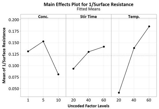 Main effects plot for the mean of the surface resistance reciprocal.