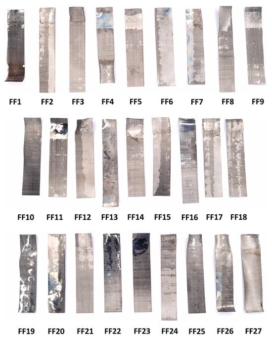 The pictures of all the platinised samples are given in Figure 11. It is clear that the platinum electrode deposition is not homogenous, with samples having regions and spots of different colours and shading. The uneven coating is also evident from the CV measurements given in Table 3, with the lowest being 39.9% for FF27. This unevenness could possibly be from the non-uniform sanding of the Nafion-117 surface and/or suboptimal fluid dynamics of the plating bath. The non-homogenous platinisation would result in uneven charge distribution along the length of the material, affecting transducing potential [24].