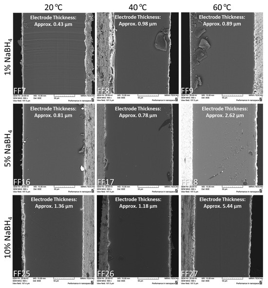 Examining Figure 14, it can generally be observed that electrode roughness improves with an increasing NaBH4 concentration and reducing temperature. This improvement is also accompanied by less instances of electrode cracking. Increased temperature and reducing agent concentration lead to denser platinum growth.